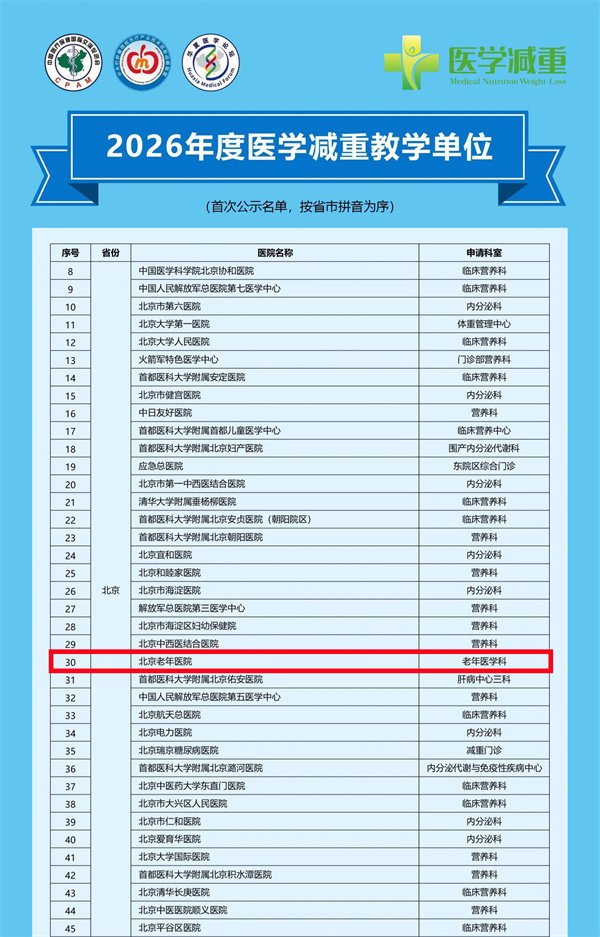 北京老年医院老年医学科凭借在老年体重管理领域深厚的专业积淀、成熟的诊疗模式及突出的教学潜力,成功获评“2026年度全国医学减重教学单位”。