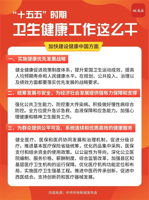 中共中央今天(10月24日)上午举行新闻发布会,介绍和解读党的二十届四中全会精神。国家卫生健康委党组书记、主任雷海潮在会上详解了“十五五”时期卫生健康工作要点,快来看看都有哪些吧!
