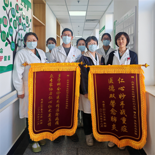 危重症患者抢救是北京老年医院呼吸内科的核心技术优势之一。经过多年的积淀与发展,科室在疑难重症疾病诊治、急危重症抢救、脓毒症休克救治等领域积累了丰富的临床经验,成功挽救了众多危重患者的生命。此次双锦旗致谢,不仅是患者及家属对科室医疗服务的高度认可,更是对医院多学科协作诊疗模式的充分肯定。