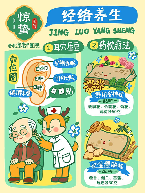 惊蛰时节“倒春寒”时有发生。老年人遵循“春捂”原则,尤其重视背、腹、足等部位的保暖;肝气在春季容易升发过度,使人情绪急躁易怒。此时应戒躁戒怒,保持心态平和,多与亲朋交流,或到户外踏青,舒畅情志。